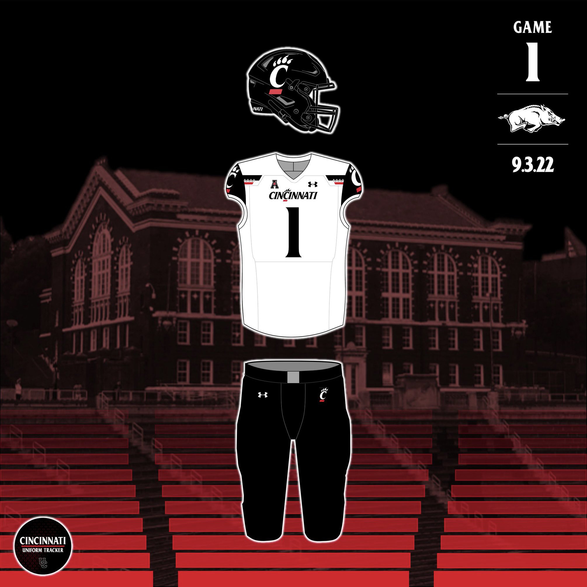 Cincinnati Uniform Tracker Pa Twitter The Bearcats Will Be Wearing Black Helmets White Jerseys And Black Pants This Saturday As They Take On Arkansas Since 2005 The Cats Are 23 16 In